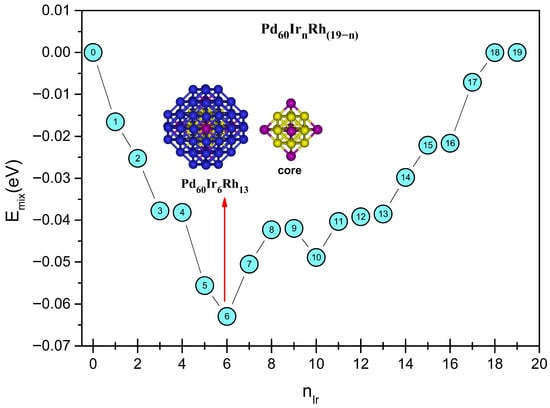 In this work, the mixing energy of Pd60IrnRh19−n (n = 0–19) trimetallic nanoclusters was calculated at the Gupta potential level. The structural model consists of 60 Pd atoms fixed at the surface of a TO, while the 19-atom interior is occupied by varying amounts of Ir and Rh. The mixing energy for each composition was computed according to the following expression [3,52]: