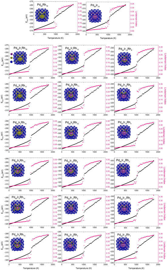 Representative caloric curves (black) and Lindemann index profiles (pink) for the Pd60IrnRh19−n nanoalloys across the full composition range. Each panel shows the temperature-dependent evolution of potential energy and atomic fluctuations, together with the corresponding nanocluster structure for reference.