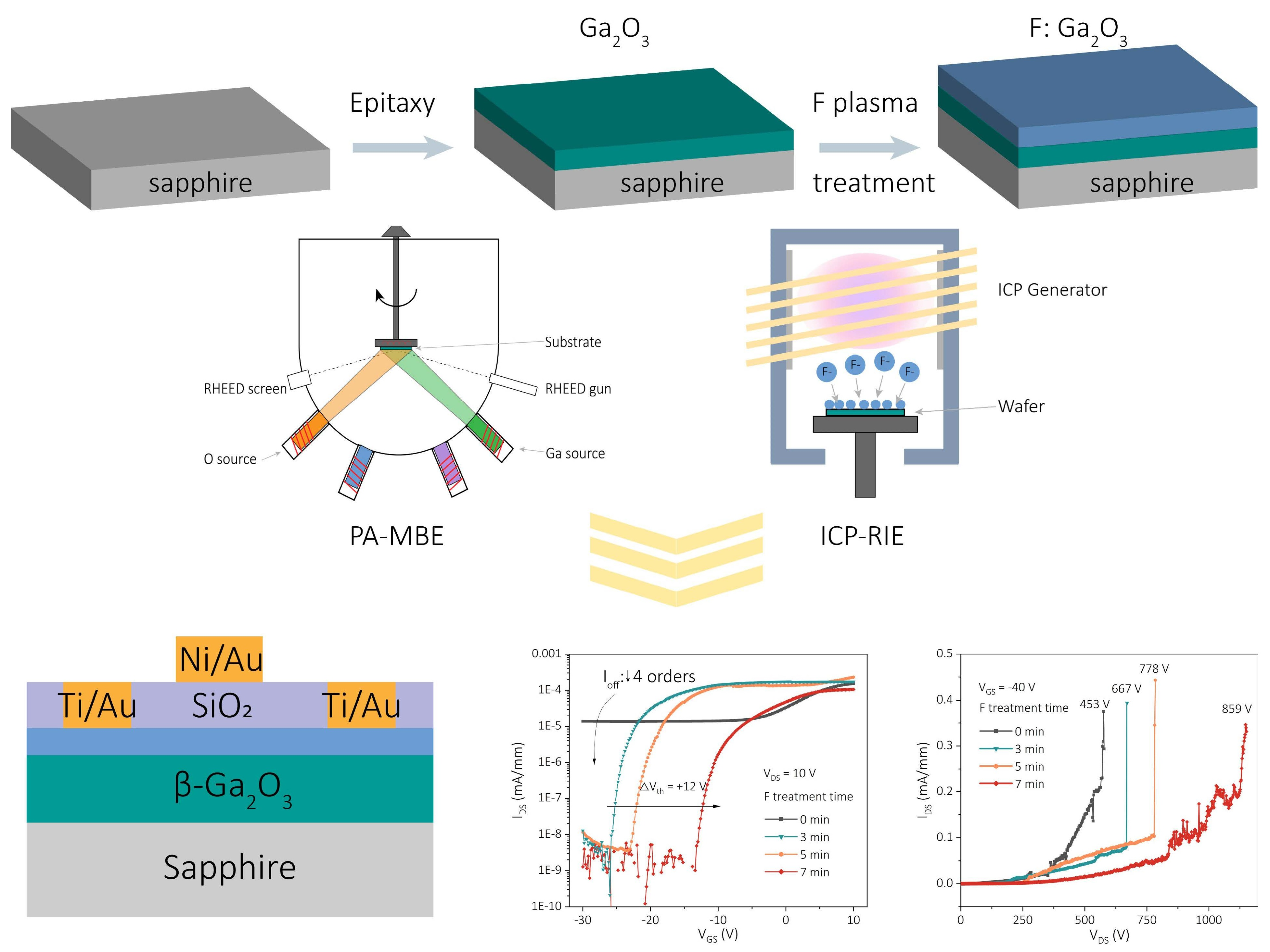 - Zeng, D.; Zhu, S.; Luo, T.; Chen, W.; Chen, Z.; Pei, Y.; Wang, G.; Lu, X. Heteroepitaxial ε-Ga2O3 MOSFETs on a 4-inch sapphire substrate with a power figure of merit of 0.29 GW/cm2. In Proceedings of the 2024 36th International Symposium on Power Semiconductor Devices and ICs (ISPSD), Bremen, Germany, 2–6 June 2024; pp. 192–195. [Google Scholar] [CrossRef]