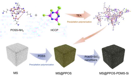 This study innovatively combines octaaminopropyl POSS, hexachlorocyclotriphosphazene (HCCP), and silica (SiO2) nanofibers to successfully overcome the critical limitations associated with single-component modifications. Through a condensation reaction between HCCP and octaaminopropyl POSS, a novel POSS-containing phosphazene polymer was synthesized. This creates a phosphorus–nitrogen–silicon ternary synergistic system that forms a more stable phosphosiloxane crosslinked network, significantly enhancing char layer strength and thermal insulation performance. The chlorine atoms in HCCP react with the amino groups of POSS to form phosphazene-POSS crosslinking points, which improve matrix integrity while reducing the risk of chlorine residue. Subsequently, incorporating silica (SiO2) nanofibers into the HCCP-POSS hybrid-modified foam further enhances the composite’s overall performance through synergistic effects. The anchoring of SiO2 nanofibers on the foam skeleton [24] effectively reduces the surface energy of the foam and increases the water contact angle, achieving superior hydrophobicity and oleophilicity. The multi-component synergistic strategy successfully integrates superior flame retardancy, thermal stability, mechanical robustness, and environmental safety. This represents a significant step toward the practical deployment of the developed material as a high-performance nano-adsorbent for oil spill cleanup.