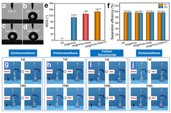 Optical images of water contact angles on (a) MS, (b) MS@PPOS, (c) MS@PPOS-PDMS, and (d) MS@PPOS-PDMS-Si surfaces. (e) Comparative water contact angle measurements of the four samples. (f) Oil–water separation efficiency during the 1st and 10th sorption-squeezing cycles for all samples. Oil–water separation performance of MS@PPOS-PDMS-Si for (g) dichloromethane, (h) chloroform, (i) carbon tetrachloride, and (j) dichloroethane during the 1st and 10th cycles.