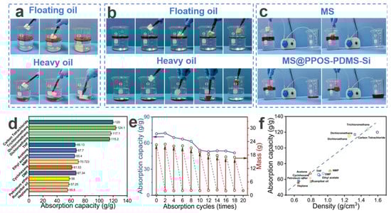 (a) MS and (b) MS@PPOS-PDMS-Si demonstrating sorption of light/heavy oils (stained with Oil Red O). (c) Comparative oil–water separation using a peristaltic pump system. (d) Absorption capacities for various oils and organic solvents. (e) Cyclic sorption performance over 20 cycles. (f) Correlation between absorption capacity and density of different oils/solvents.