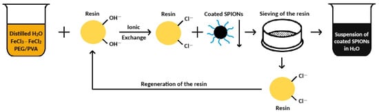 For the synthesis of SPIONs coated with PVA or PEG, the following reagents were considered: iron(III) chloride hexahydrate (FeCl3·6H2O) and iron(II) chloride tetrahydrate (FeCl2·4H2O) supplied by Carlo Erba Reagents (Milano, IT); anionic exchange resin, used in OH- form, (R-OH) Euroresin SAG-1 FB, supplied by Sicania Chimica (Catania, IT); polyethylene glycol (PEG) with a length chain of 2000 units (PEG-2000) with a molecular weight of 1900–2200 g/mol, and polyvinyl alcohol (PVA), with a molecular weight of 89,000–98,000 g/mol, both supplied by Sigma Aldrich (St. Louis, MO, USA). The only solvent used was distilled water.