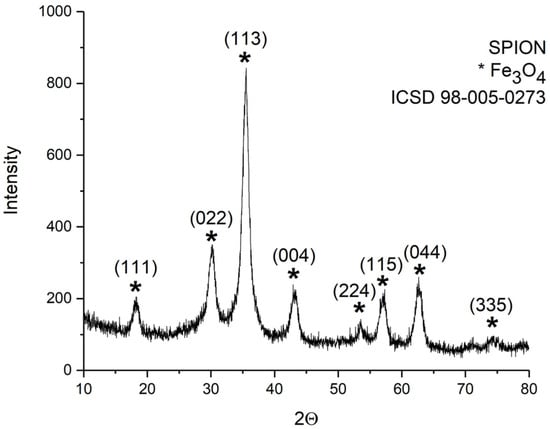 The XRD pattern of the sample SPION is reported in Figure 2. From the analysis, it perfectly matched the cubic spinel structure of magnetite crystalline structure (ICSD standard reference code: 98-005-0273 [36]).