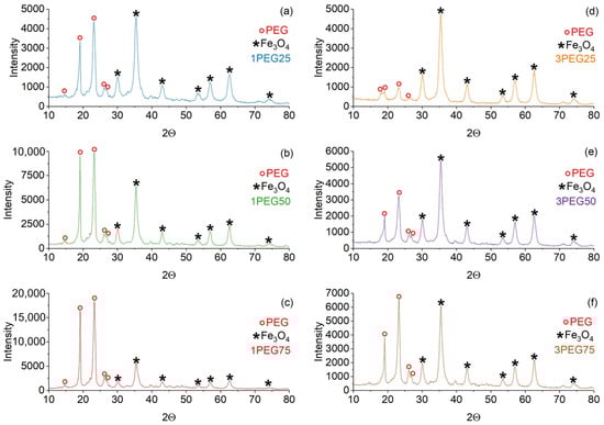 Figure 3. XRD patterns of PEG-SPION dried samples. On the left: (a) 1PEG25; (b) 1PEG50; (c) 1PEG75. On the right: (d) 3PEG25; (e) 3PEG50; (f) 3PEG75. The red circle marker represents the PEG peaks, while the black star marker represents the Fe3O4 peaks.