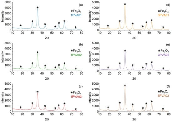 Figure 4. Comparison of the XRD patterns of the PVA-SPION samples. On the left: (a) 1PVA01; (b) 1PVA02; (c) 1PVA03. On the right: (d) 3PVA01; (e) 3PVA02; (f) 3PVA03. The black star marker represents the Fe3O4 peaks.