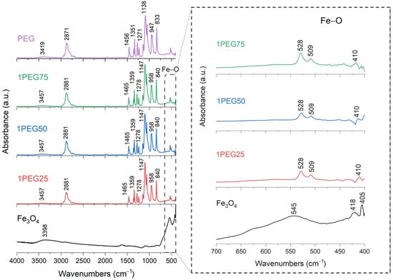 Figure 5. FT-IR analysis of 1PEG25, 1PEG50, 1PEG75 samples. In the inset: the absorption bands of the Fe-O bond at 545 cm−1, to underline the shift towards lower wavenumbers and the splitting characteristics of PEG-SPION samples.