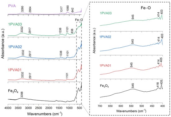 Figure 7. FT-IR analysis of 1PVA01, 1PVA02, 1PVA03 samples. In the inset: the absorption bands of the Fe-O bond at 545 cm−1, to underline the shift towards lower wavenumbers and decreasing signal characteristics of PVA-SPION samples.