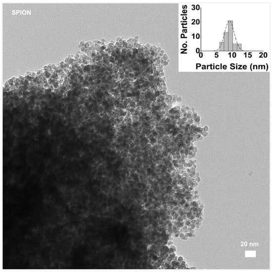The morphologies and sizes of the prepared polymer-modified magnetite were analyzed by TEM. For this aim, at first, we observed the prepared magnetite (Fe3O4) NPs alone, as shown in Figure 9. Both the morphology and monodispersed distribution of the magnetite particles offer an important starting point, allowing for a uniform surface area for coating and conjugation of targeting ligands or therapeutic agents.
