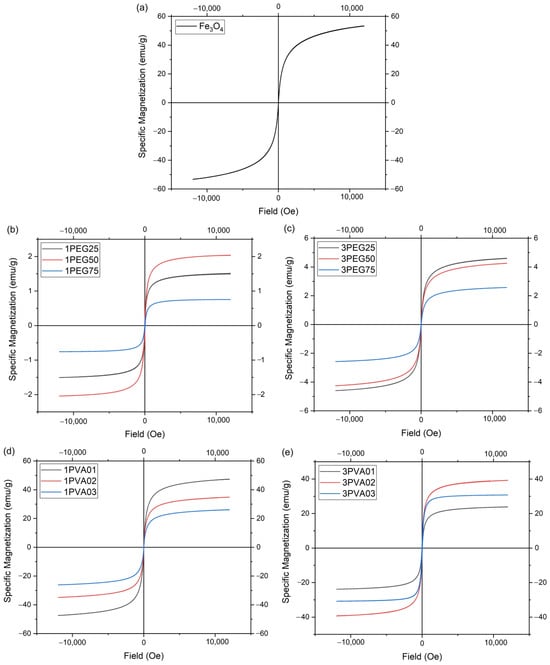 The 1PEG and 3PEG samples (Figure 13b,c) showed no hysteresis loop at each concentration, which meant that the particles exhibit superparamagnetic behavior. The 1PEG50 sample exhibited the highest magnetization value of the 1PEG series, while the 3PEG series had a decrease in the magnetization value across increasing polymer concentrations. The 3PEG series had higher magnetization values than the 1PEG series, but all the samples had a much lower magnetization value than the bare magnetite nanoparticles produced with the patented method [21,22]. This can be explained in part by the low ratio of Fe, as seen by ICP-OES analysis, and the great fraction of PEG present in the samples, as seen by the TGA, as the magnetic saturation of magnetite nanoparticles decreased significantly with the increasing coating thickness of the non-magnetic layer [38], in part due to other causes. For example, the contamination and deterioration of surface spins of the magnetite core caused by the polymer coating, as seen in similar cases [37].