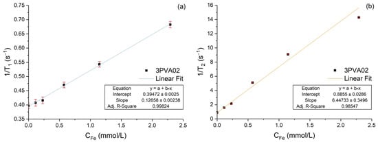 Figure 14. Relaxation rates versus iron molar concentration of the sample 3PVA02: (a) longitudinal (1/T1), (b) transverse (1/T2). The lines are the data linear fits, and the insets report the relaxivity values as well as the regression coefficients.