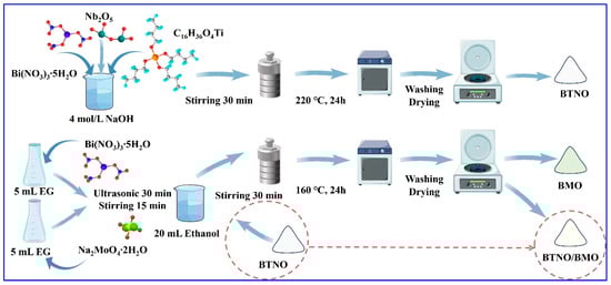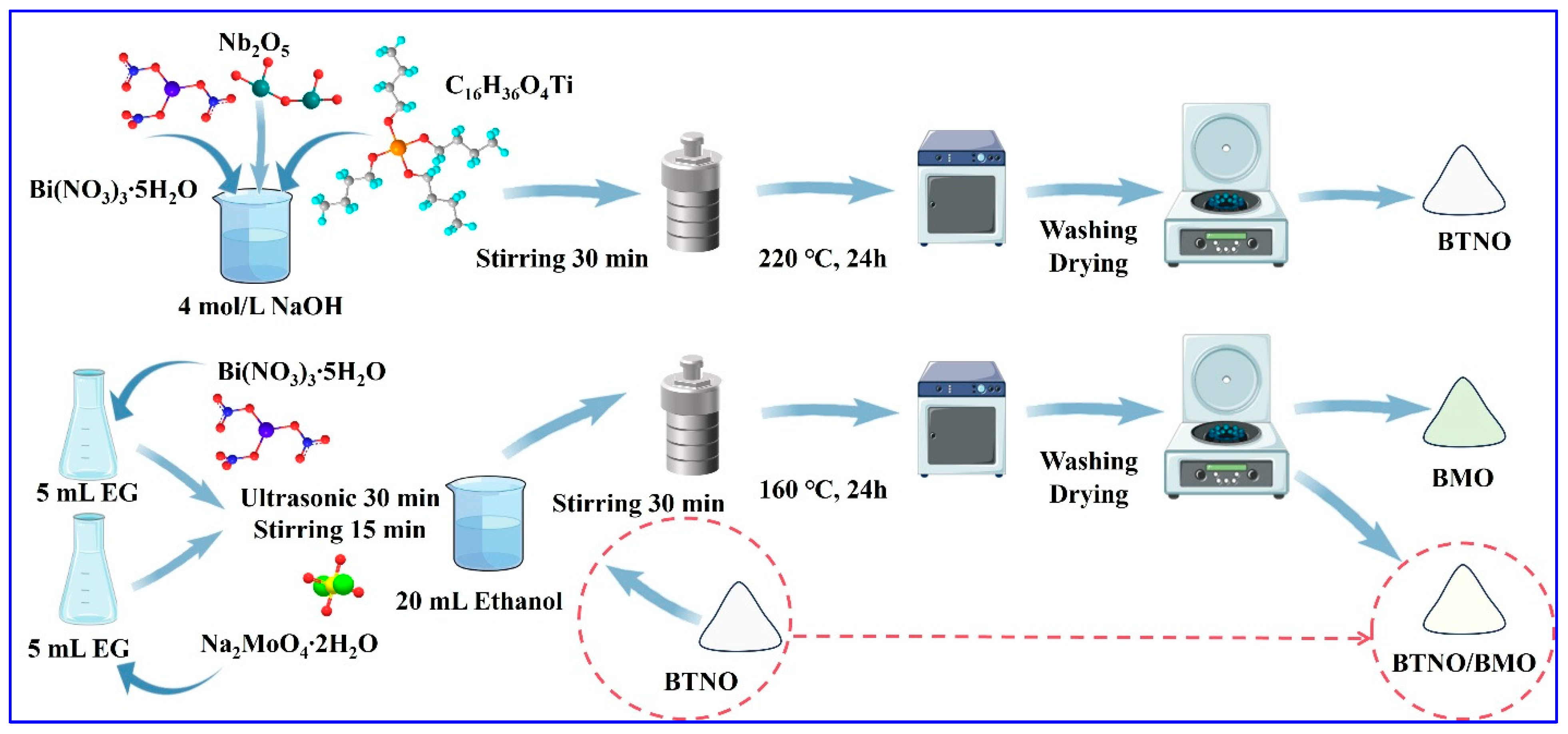 Synthesis of BTNO/BMO: The heterojunction was prepared based on the theoretical mass of BMO being 10% of the BTNO mass. To integrate the desired BTNO/BMO photocatalyst, 0.0485 g of Bi(NO3)3·5H2O and 0.0120 g of Na2MoO4·2H2O were separately dissolved in 5 mL of ethylene glycol under ultrasonication for 30 min. The two solutions were mixed and stirred for 15 min to yield Solution A. Meanwhile, 304.5 mg of as-synthesized BTNO was uniformly dispersed in 20 mL of ethanol via ultrasonication for 30 min, forming Solution B. Solution B was then poured into Solution A under stirring for 30 min. The mixture was transferred into a 100 mL Teflon-lined autoclave and reacted at 160 °C for 12 h. The final product was collected, washed three times with deionized water and ethanol, and dried under vacuum at 60 °C for 12 h. The obtained sample was labeled as BTNO/BMO. A schematic diagram of the synthesis process is illustrated in Figure 1.