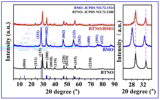 XRD patterns of as-obtained BTNO, BMO, and BTNO/BMO photocatalysts.