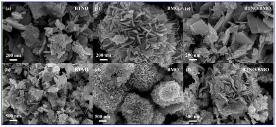 The morphology/microstructure of the pristine BTNO, BMO, and as-integrated BTNO/BMO heterojunction were examined by scanning electron microscopy (SEM), as presented in Figure 3. The pure BTNO sample exhibits an architecture of irregularly stacked nanosheets with non-uniform sizes (Figure 3a,b). In contrast, pure BMO self-assembles into hierarchical microspheres composed of interconnected nanosheets (Figure 3c,d). As exhibited in Figure 3e,f, the as-integrated BTNO/BMO heterojunction reveals a closely integrated structure where the two components form a compact assembly of nanosheets. Notably, the nanosheets in the composite appear larger than those in pristine BTNO, and the overall packing is denser. This unique hierarchical architecture is advantageous for photocatalysis for the following reasons: (i) the nanosheet building blocks may provide a high specific surface area, facilitate reactant adsorption, and offer abundant active sites; (ii) the two-dimensional nature of nanosheets shortens the migration path for photogenerated charge carriers to the surface, thereby reducing the likelihood of bulk recombination. While the spherical superstructures of the BMO photocatalyst retain a high surface area, they also improve light-harvesting efficiency through enhanced light scattering and provide porous channels for mass transport [33]. However, it should be noted that excessive agglomeration could increase charge recombination and compromise photocatalytic performance. Hence, achieving optimal structural compactness is crucial.