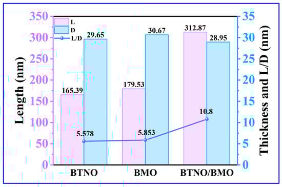Furthermore, statistical analysis of the dimensions and thicknesses of the three materials was performed based on the SEM profiles. As illustrated in Figure 4, the average lateral size of the BTNO/BMO heterojunction increased to 312.87 nm, compared to 165.39 nm for BTNO and 179.53 nm for BMO. In contrast, the three photocatalysts exhibited similar thicknesses: BTNO, BMO and BTNO/BMO measured 29.65 nm, 30.67 nm and 28.95 nm, respectively. Consequently, the aspect ratio (the ratio of lateral size to thickness) of the composite increased significantly, from 5.58 for BTNO and 5.85 for BMO to 10.80 for the heterojunction (Figure 5). This elevated aspect ratio is expected to enhance photon capture, establish more efficient charge transport pathways, and suppress the electron–hole recombination, thereby supplying more energy for photocatalytic reactions.