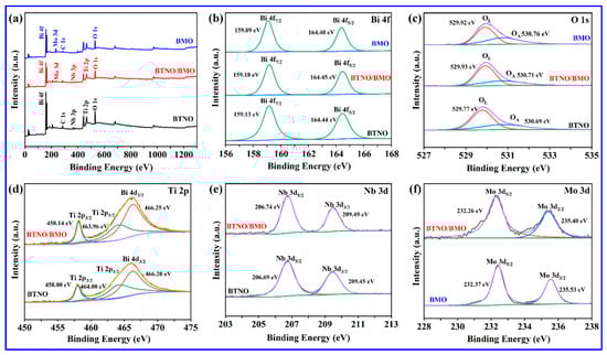 XPS characterization confirming interfacial charge transfer: (a) the survey spectra and (b–f) high-resolution spectra of key elements Bi 4f, O 1s, Ti 2p, Nb 3d, Mo 3d for BTNO, BMO, and as-integrated BTNO/BMO heterojunction.