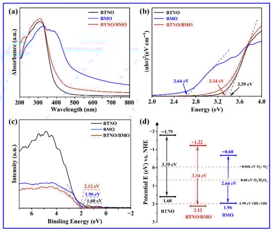 Optical properties and electronic band structures analysis: (a) UV-Vis DRS; (b) corresponding Tauc plots; (c) XPS valence band measurements; and (d) schematic illustration of the energy band alignment for BTNO, BMO, and BTNO/BMO photocatalysts.