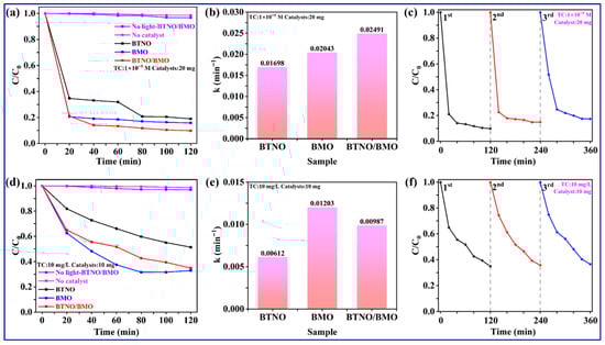 Photocatalytic degradation of TC under different conditions: (a,b) degradation profiles and kinetic fitting curves for a 1 × 10−5 M TC solution; (d,e) degradation profiles and kinetic fitting curves for a 10.0 mg/L TC solution. Recyclability of the BTNO/BMO heterojunction for degradation of (c) 1 × 10−5 M and (f) 10.0 mg/L of TC under visible-light irradiation over three consecutive cycles, respectively.