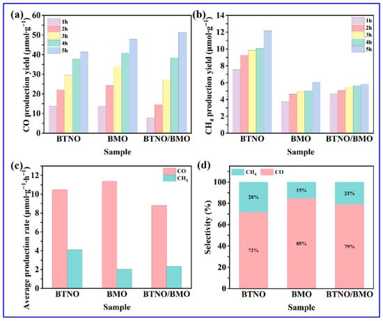 Finally, the visible-light photocatalytic capability of as-obtained samples was evaluated via CO2 reduction. As shown in Figure 11a,b, the yields of CO and Methane (CH4) for all photocatalysts increased gradually over the 5 h visible-light irradiation period. It can be noticed that the CO yield showed a particularly pronounced upward trend. After 5 h, the total CO yields for BTNO, BMO, and BTNO/BMO reached 41.3 μmol·g−1, 47.9 μmol·g−1, and 51.3 μmol·g−1, respectively. In contrast, the increase in CH4 yield was more modest, with final amounts of 12.1 μmol·g−1 for BTNO, 6.1 μmol·g−1 for BMO, and 5.8 μmol·g−1 for BTNO/BMO, respectively. The average production rates, calculated over the 5 h period, provide further insight into catalytic behavior (Figure 11c). For CO production, pristine BMO exhibited the highest average rate of 11.39 μmol·g−1·h−1, followed by BTNO with 10.47 μmol·g−1·h−1, with the as-integrated BTNO/BMO heterojunction showing a slightly lower rate of 8.80 μmol·g−1·h−1, respectively. Conversely, for CH4 production, BTNO demonstrated the highest average rate with 4.08 μmol·g−1·h−1, while the heterojunction displayed 2.33 μmol·g−1·h−1 yield, slightly outperforming pristine BMO, which exhibited 2.04 μmol·g−1·h−1 CH4 production. As summarized in Figure 11d, all catalysts exhibited high selectivity towards CO, with the heterojunction’s selectivity intermediate between the two pristine materials, consistent with its composite nature [52]. The distinct product distribution suggests that the interfacial engineering in BTNO/BMO modulates the reaction pathway and energy barriers for different reduction products.