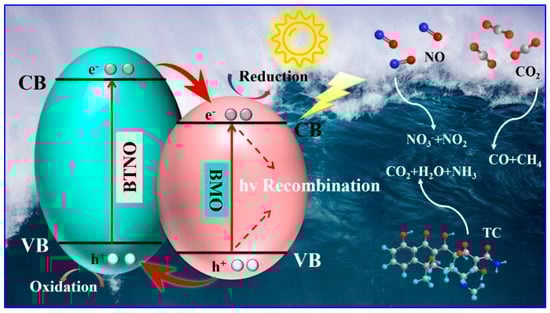 Based on the foregoing analysis, a reaction mechanism for the enhanced photocatalytic performance of the as-integrated BTNO/BMO heterojunction is proposed (Figure 12). This mechanism accounts for the efficacy of photocatalysts in diverse applications including aquatic pollutant degradation and atmospheric hazardous remediation. The coupling of energy bands at the heterojunction interface modifies the original band alignments, effectively widening the composite’s responsive energy landscape. Under visible-light irradiation, electrons in BTNO are excited from the valence band to the conduction band. The intimate contact between BTNO and BMO facilitates the formation of a Type-II heterostructure. This configuration drives the transfer of photoinduced electrons from the conduction band of BTNO to that of BMO, while simultaneously directing holes from the valence band of BMO to that of BTNO. This spatial charge separation effectively suppresses carrier recombination, thereby enhancing the utilization efficiency of photogenerated charge carriers. The separated charges subsequently initiate surface redox reactions. The accumulated electrons and holes promote the generation of photocatalytically active oxygen species, which through synergistic action, progressively decompose complex antibiotic molecules into simpler organic intermediates, ultimately achieving complete mineralization into CO2, H2O, and inorganic ions. Furthermore, the electrons facilitate the reduction of stable CO2 molecules to CO and CH4, while the holes contribute to the oxidation of NO, primarily to nitrate (NO3−) with trace amounts of NO2.