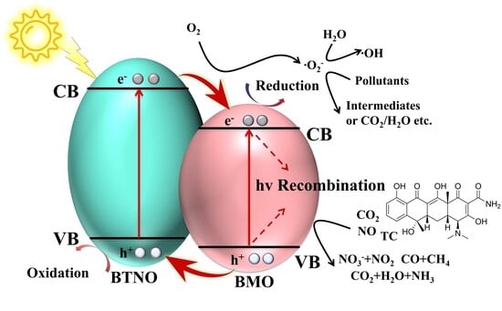 In summary, a novel BTNO/BMO heterojunction composite was successfully constructed via a solvothermal method and demonstrated high-performance photocatalytic activity for environmental purification. The composite effectively integrates the structural and optical advantages of its components, exhibiting a widened light absorption range and enhanced charge separation efficiency compared to the pristine materials. The photocatalytic performance was systematically evaluated across both oxidation and reduction processes. For oxidation reactions, the heterojunction showed superior activity in the degradation of aqueous tetracycline and the removal of gaseous NO. For reduction reactions, it facilitated the conversion of CO2 into solar fuels, primarily CO. The significantly enhanced activity across these diverse reactions is primarily attributed to the formation of a Type-II heterostructure, which drives the spatial separation of photogenerated electron–hole pairs, thereby increasing the availability of charge carriers for surface redox reactions. This work provides valuable insights into the design of efficient, dual-functional photocatalysts capable of managing both oxidative pollutant degradation and reductive energy conversion, offering a promising strategy for addressing intertwined environmental and energy challenges.