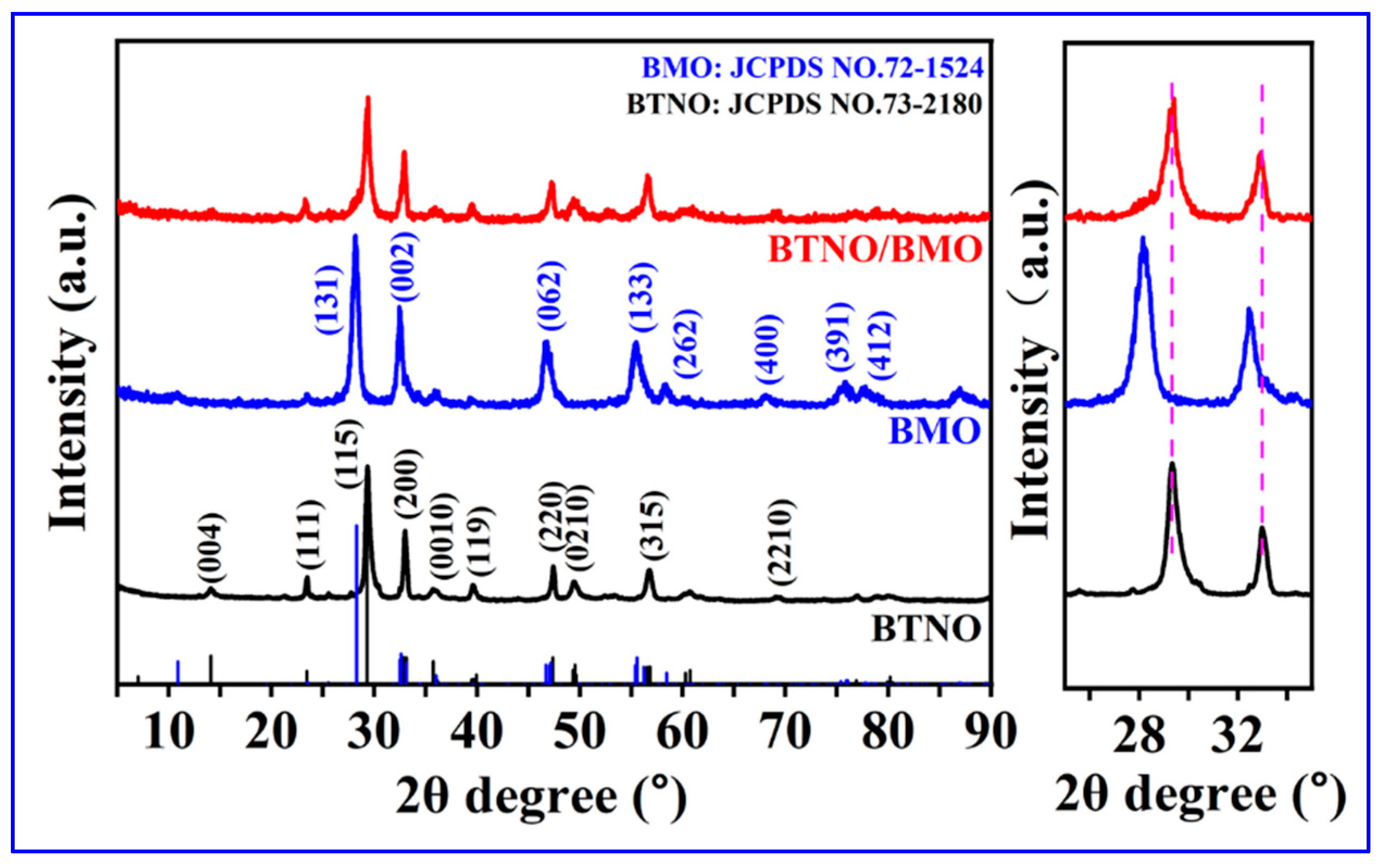 The crystal structures of the as-synthesized BTNO, BMO, and BTNO/BMO composite were first investigated by X-ray diffraction (XRD, Figure 2, left). The diffraction pattern of the pristine BTNO sample aligns well with the orthorhombic phase of BTNO (JCPDS No. 73-2180), exhibiting characteristic peaks corresponding to the (111), (115), (200), (0010), (220) and (315) planes, with no detectable impurity phases. Similarly, the pattern for pure BMO matches well with the standard card (JCPDS No. 72-1524), showing distinct peaks such as (131), (002), (062), and (133), which confirms its high purity. In the composite sample, where BTNO is the major component, the XRD pattern is dominated by the diffraction peaks of BTNO. However, a closer examination of the magnified region between 25° and 35° reveals slight but discernible shifts in the peak positions compared to pure BTNO (Figure 2, right). These shifts confirm the successful integration of BMO and the formation of the BTNO/BMO heterojunction, which likely induces lattice strain at the interface as further evidenced by calculated lattice strains in Table 1.