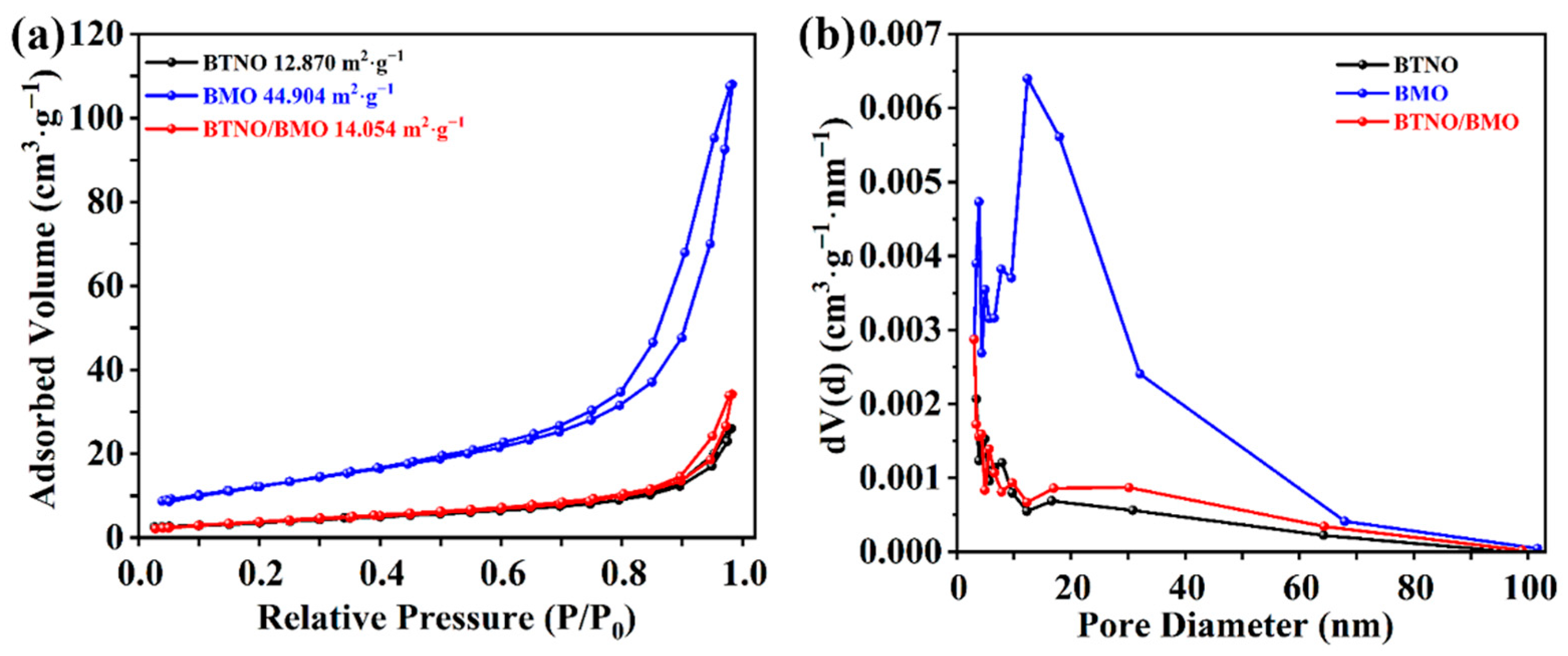 Comparative analysis of the porous texture: (a) N2 adsorption–desorption isotherms and (b) pore size distribution for pristine BTNO, BMO, and as-integrated BTNO/BMO heterojunction.