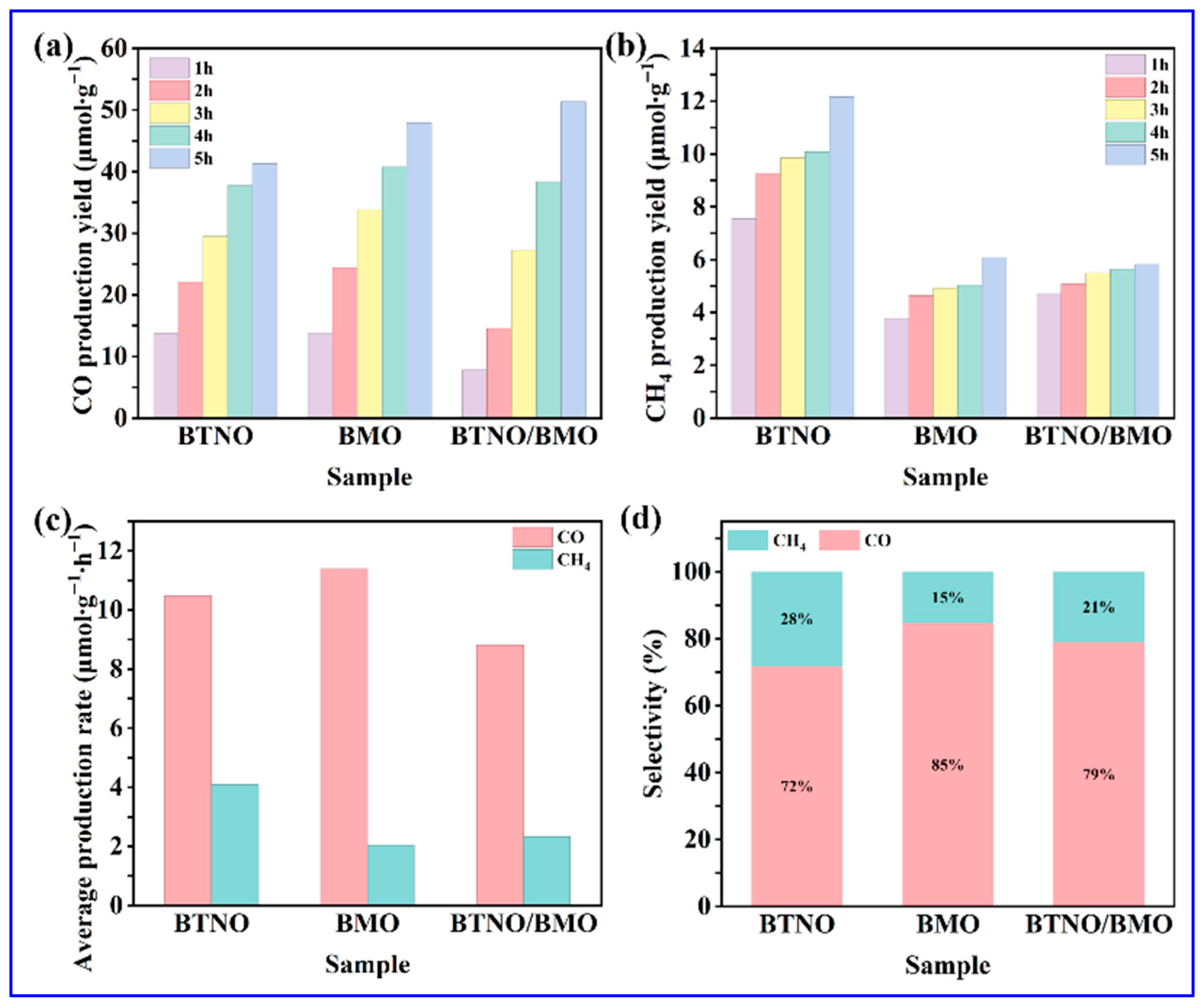 Visible light Driven photocatalytic CO2 reduction performance: (a,b) Time-dependent CO and CH4 evolution, (c) average production rates over 5 h visible-light illumination, and (d) CO2 reduction product selectivity for BTNO, BMO, and BTNO/BMO photocatalyst, respectively.