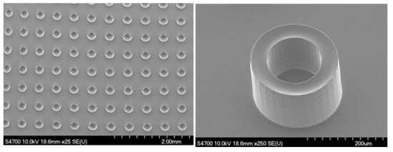 ANLC (addressable nanoliter container) array under microscope. (Left) Part of the SU8-5, 5 × 5 mm2 chip. Each compartment acts as an individual, isolated reaction ANLC, in which individual live cells can be captured. (Right) Side view of a single ANLC (diameter: 250 μm, height: 250 μm⟹ volume: 1.2 × 10−9 L).