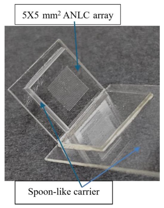 The ANLC array (Figure 1) was fabricated using a Photo Lithographic Patterning technique. A sheet of 175 µm thick borosilicate glass, type D263 (GeSiM, Radeberg, Germany) was spin-coated at 3500 rpm with SU8-5 photoresist, to a thickness of 2–2.5 µm. The ANLC array was patterned on the photoresist by illuminating it through a prefabricated chromium mask. This was followed by thermal annealing at 175 °C for 60 min, resulting in stiff, smooth surfaces of the structured SU8-5 ANLC. Finally, the arrayed glass was sawed into 5 × 5 mm2 chips, cleaned (mainly from glass debris) using water jetting, dried with clean compressed air, and kept in antistatic bags until fabrication. Then, the ANLC arrays were glued onto a standard microscope slide with a droplet of NOA81 (Norland Optical Adhesives, Jamesberg, NJ, USA) and cured with UV light for 25 s. The ANLC array was suited for conventional cryopreservation by gluing it to a spoon-like handle, made of plastic or 0.3 mm aluminum foil, and then stored in a standard cryo-tube (Figure 2).