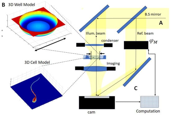 Components of the simulation model. (A) Interferometric microscope: The monochromatic light beam is split into reference and imaging illumination arms, along which a condensing lens is used to create the desired location on the specimen plane (φM stands for modulator). As light passes through the specimen, its phase is shifted according to the distribution of the optical path length. The outgoing beam is transmitted into the camera plane (cam) by means of an imaging lens. The phase-shifted reference beam (C) is directed into the same camera plane where an interference pattern is created. (B) Model of the ANLC with its geometry, which includes shape distortions and relevant optical indices of refraction, and a 3D model of the sperm cell, which is to be analyzed by the interferometric microscope.