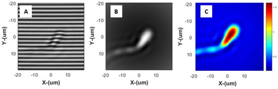 Analysis stages of interferometric data. Distances are measured in μ(u)m. (A) The interference pattern obtained on the camera plane is composed of fringes where the spatial separation depends on the illumination wavelength and angle of incidence given to the reference beam. (B) Small deviations from the interference fringes raster are attributed to phase shifts imposed on the beam by the specimen under investigation, where the ideal phase distribution is directly related to the actual original optical path length phase distribution on the camera. Using an algorithmic process, the retrieved, calculated, and enhanced phase optical path distribution shown in (C) can be obtained.