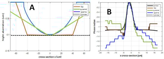 Cross-sections of the 4 ANLC designs. (A) Pyramidal (green), cylinder with a concave bottom (blue), truncated inverted pyramid (orange), and a cylinder (dashed black line). (B) Corresponding retrieved phase cross-sections.