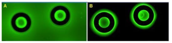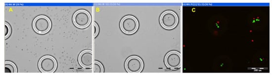 Fluorescein diacetate (FDA) and propidium iodide (PI) (Sigma-Aldritch) fluorescent dyes were added to the Molt 4 cell suspension. Then, the suspension was loaded onto the ANLC array and into a standard cryo-tube (control). The ANLC array was carefully washed using a pipette with Quinn’s Advantage Sperm Washing Medium (Al-Rad Medical, Ltd., Ness Tziona, Israel), and a bright field image of the same region was taken before (Figure 8A) and after (Figure 8B) washing. It is evident that cells that are lodged between ANLCs can be easily washed out, while cells within the ANLC retain their position. The fluorescent image (Figure 8C), taken after thawing, demonstrates that most cells inside the ANLC are alive. The green fluorescing spots are FDA-positive (live cells), and the red spots are PI-positive (dead cells). Similar experiments were performed using vessels of various diameters, with volumes of 5 µL, all showing similar results.