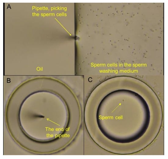 Figure 9 illustrates the step-by-step process of using the ANLC device from sample loading to sperm identification and isolation. Sperm cells were collected using a micro-manipulator pipette. The pipette, via the micromanipulator, was brought into the proximity of the sperm cells (suspended in a drop of medium, covered by a layer of oil (Figure 9A)), after which cells were collected by gentle pumping. Then, the collected sperm cells were released into a cryo-preservation medium inside vessels with varying diameters, covered by oil (Figure 9B,C). The sperm cell suspension was also loaded into a standard cryo-tube for the control experiment.