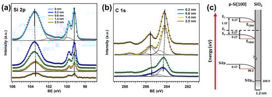 PES spectra (400 eV of photon energy) as a function of the film thickness of the (a) Si 2p and (b) C 1s core levels. Solid lines are the core level BE and dashed lines highlight the core level shifts as a function of the increasing film thickness; (c) the energy level model of the SiO2/p-Si(100) surface, reconstructed from the Si 2p core level of the clean substrate. The band bending and nominal thickness of the oxide layer were calculated using Equations (S1) and (S2) (Supplementary Materials Section S1).