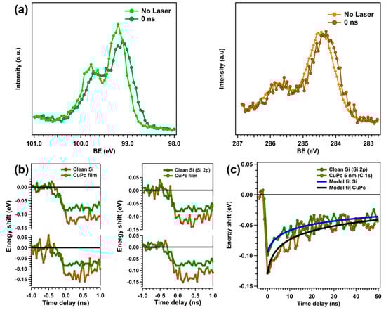 (a) Clean substrate (Si 2p core level) and heterojunction (C 1s core level) energy shifts upon laser excitation; (b) SPV dynamics after CuPc deposition at different film thicknesses (brown curves). The SPV relaxation curve of the clean substrate (green curves) is shown for comparison to highlight the enhancement of the SPV signal after CuPc deposition; (c) comparison between the clean substrate (Si 2p core level) and heterojunction (C 1s core level) SPV relaxation curves at longer time delays and the relative fits obtained by thermionic modeling.