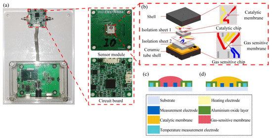 (a) A physical diagram of the MOS sensor; (b) the sensing module; (c) the design of the gas-sensitive chip; and (d) the design of the catalytic chip.