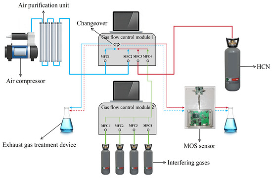 The test platform is shown in Figure 3. Air is supplied by an air compressor, and through the air purification device, the purified air is divided into two paths, MFC1 and MFC2 (referred to as 1-MFC1 and 1-MFC2) in gas flow control module 1. Hydrogen cyanide is supplied by gas cylinders, and enters MFC3 (referred to as 1-MFC3) in the gas flow control module 1. The interfering gases are supplied by gas cylinders, and the interfering gases enter MFC1, MFC2, MFC3, and MFC4 (referred to as 2-MFC1, 2-MFC2, 2-MFC3, and 2-MFC4) in the gas flow control module 2. Each of the above gases can be adjusted for flow size. The interfering gases are mixed after passing through 2-MFC1, 2-MFC2, 2-MFC3, and 2-MFC4, and the mixed interfering gases enter MFC4 (referred to as 1-MFC4) in gas flow control module 1. After mixing, 1-MFC2+1-MFC3+1-MFC4 will form a toxic agent path and 1-MFC1 will form an air path. Switching the toxic agent path with the air path can be realized by controlling the changeover, which alternately enters the MOS sensor through a pipe of approximately 0.3 m and the exhaust gas treatment device, as shown in the dashed lines of the figure.