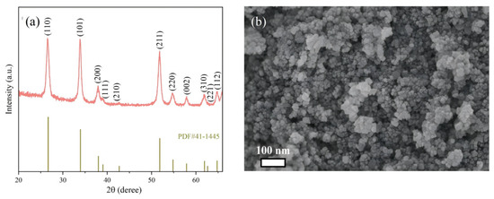 Nano Pt@SnO2 powders covered with clusters of about 20 nm in diameter forming uniformly interconnected nanocrystals were synthesized by a non-aqueous sol–gel method. Figure 4a shows the XRD pattern of Pt@SnO2 powder, which was measured with Cu Kα radiation on a Philips X’Pert diffractometer (2θ from 10° to 80°, λ = 1.5406 Å, Amsterdam, The Netherlands). It can be seen that Pt@SnO2 has a high purity and crystallinity, with almost no impurity peaks. SnO2 can be indexed with reference to the corresponding standard card (20-1324), and because of the small amount of Pt4+, this figure does not clearly show the information related to these modifying elements. The SEM image of Pt@SnO2 powder is shown in Figure 4b.