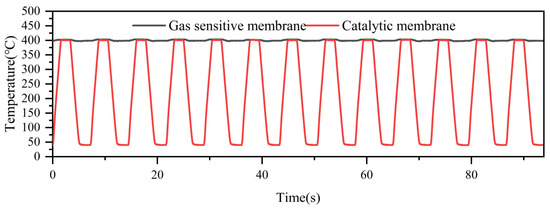 Figure 5 demonstrates the temperature curve of the CeMnOx/Pt@SnO2 sensor under the temperature dynamic modulation (a constant temperature of 400 °C for the gas-sensitive layer and a variable temperature from room temperature to 400 °C for the catalytic layer; the heating and cooling rates were 200 °C/s; the highest temperature was maintained for 2 s; and the lowest temperature was maintained for 2 s). From the figure, it can be seen that the noise of the gas-sensitive layer was ±4 °C at 400 °C, the noise of the catalytic layer was ±2 °C at 400 °C, and the noise was ±2 °C at room temperature (the catalytic layer is about 40 °C at room temperature, which is due to the heating that causes the temperature inside the chamber to increase and cannot be quickly recovered to the actual room temperature), and the period of a single temperature change was about 7.2 s. It is shown that the temperature dynamic modulation of the sensor was accurate, stable, and fast.