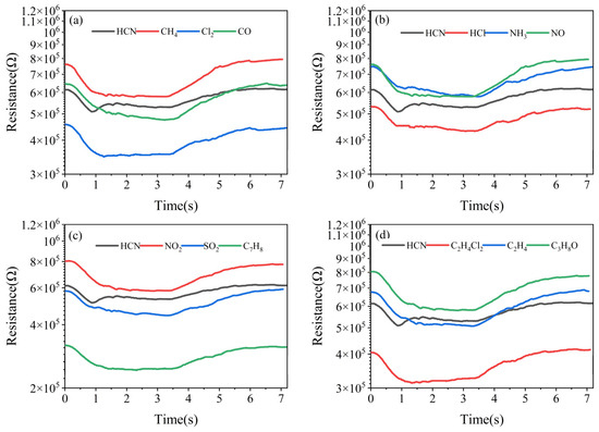 Resistance response of the sensor to (a) HCN, CH4, Cl2, CO; (b) HCN, HCl, NH3, NO; (c) HCN, NO2, SO2, C7H8; (d) HCN, C2H4Cl2, C2H4, C3H8O.