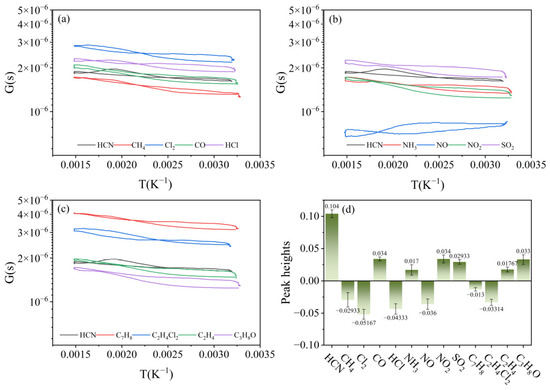 Compared to the interfering gases, the G-T curve of HCN would have a more prominent peak at T = 0.00192 K−1. By calculating the peak height, the maximum value of the characteristic peak height of interfering gases was 0.034, which was obviously lower than that of the characteristic peak height of HCN (0.104), as shown in Figure 9d. This indicated that it was feasible to evaluate the high selectivity of the sensor for HCN by the characteristic peak and to use the peak height to realize the quantification of the selectivity.