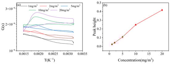 Figure 10a shows the G-T curves of the sensor for different HCN concentrations under the above temperature dynamic modulation, and they are gradually shifted upward with the increase in the HCN concentration. As shown in Figure 10b, the peak height of HCN increased gradually with the increase in the HCN concentration. When the HCN concentration was 2 mg/m3, the peak height was about 0.044, which was higher than the peak height of any interfering gas at 5 mg/m3, indicating that the sensor had better sensitivity for HCN; when the HCN concentration was as low as 0.1 mg/m3, the peak height was close to 0, which indicated that the sensor’s minimum detection limit for HCN was about 0.1 mg/m3.