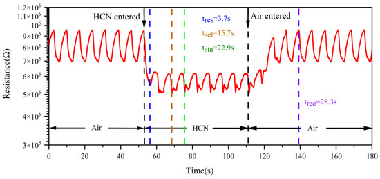 Figure 11 shows the resistance response curve of the sensor to 5 mg/m3 HCN under the above temperature dynamic modulation. As shown in the figure, the air was switched to HCN at 52.7 s. When HCN entered, the resistance of the sensor began to decrease, and when the response curve began to change, it indicated that the sensor had detected HCN, at which time the response time was about 3.7 s. This indicated that the sensor had a fast response to HCN. With the increase in HCN fluence time, the characteristic peaks began to appear in the response curve, and the characteristic peaks were more obvious after 15.7 s. At this time, the sensor showed high selectivity to HCN. The peak height of the characteristic peaks gradually increased with the continuous increase in HCN fluence time, and finally reached a stable state after 22.9 s. HCN was switched to air at 111.3 s. When air entered, the resistance of the sensor began to recover gradually and recovered to the steady state of air at 139.6 s. The recovery time was about 28.3 s.