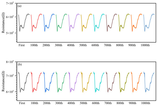 In order to test the stability of this sensor under the above temperature dynamic modulation, we continuously tested the sensor 1000 times to 5 mg/m3 HCN and recorded the resistance response curves (1 pulse recorded every 100 times). The test results are shown in Figure 12a. It can be seen that the resistance curve of the 1000th time was not significantly different from that of the first time, and there was almost no change to the characteristic peak of HCN. The fluctuation range of the peak height was obtained as 0.101~0.105 by calculation, which indicated that the sensor was of good stability. The same test was performed again after 133 days, and it can be seen that the characteristic peaks of the sensor for HCN have slightly decreased, but a clear characteristic peak can still be observed, and the fluctuation of the peak height was in the range of 0.085~0.093, as shown in Figure 12b.
