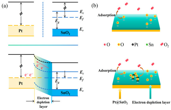 Pt nanoparticles can form new active sites on the SnO2 surface. On the one hand, Pt and Rh nanoparticles themselves can act as active centers and directly participate in the reaction process by adsorbing and activating HD molecules. On the other hand, they can also induce more defects and oxygen vacancies on the SnO2 surface, which are surrounded by atoms with higher chemical activity that can interact more strongly with reducing gases, thus increasing the reaction activity, as shown in Figure 14b.