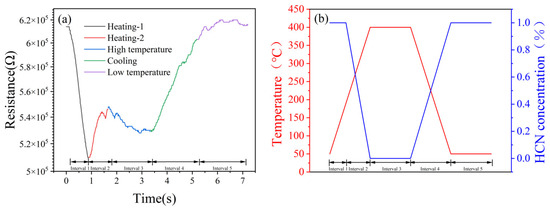 (a) Five intervals of a single cycle; (b) simulation of temperature and corresponding HCN concentration on the surface of the gas-sensitive layer during a single cycle.