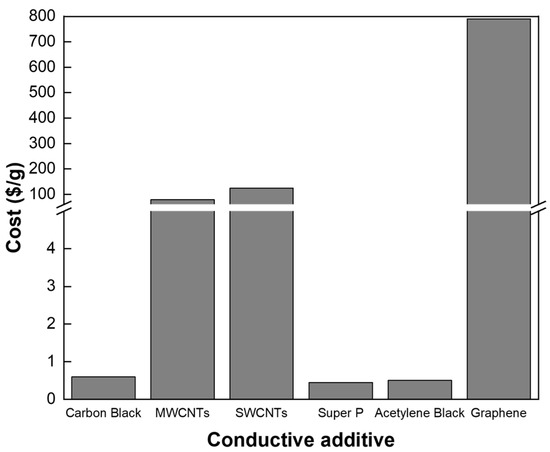 Comparison of various types of conductive additives for electrode fabrication and their costs per gram.