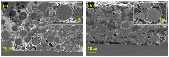 Commercial LiNi0.8Co0.1Mn0.1O2 (NCM811) and LiNi0.92Co0.07Mn0.01O2 (Ni92%) cathodes were used as active materials. SEM (JSM-IT500, JEOL, Tokyo Japan at 10 kV) was used to observe the morphologies and particle sizes of active materials. Cross-sectional images of the internal structures of the fabricated electrodes were obtained using a focused ion beam (Crossbeam 550, ZEISS, Oberkochen, Germany, at 5 kV).